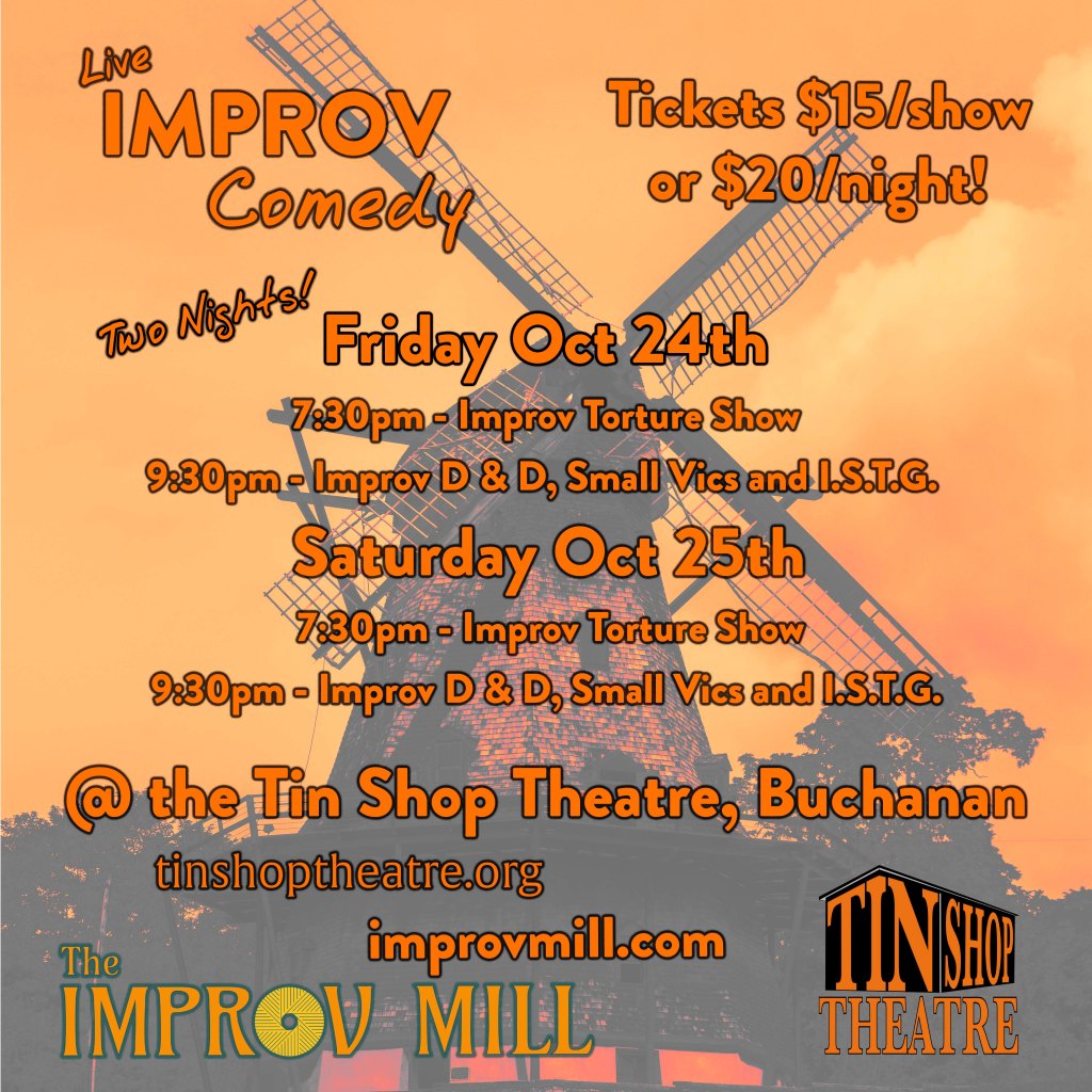 Friday May 9th, Friday July 11th and Fri/Sat October 24th and 25th! Improv Mill and Tin Shop Theatre bring you live improv comedy.