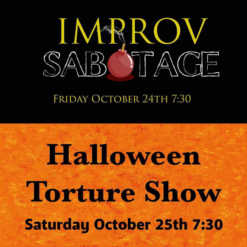 Friday, October 24th 7:30PM – Friday’s Halloween Torture Show subjects the improvisers to a different kind of torture as they participate in Improv Sabotage, where scenic hurtles are thrown down to challenge and trip up even the most skilled players. Which of our three teams will come out on top? Will it be in spite of or because of the sabotages? Come find out at 7:30. Show runs approximately 90 minutes. Unrated, may contain adult themes/content.